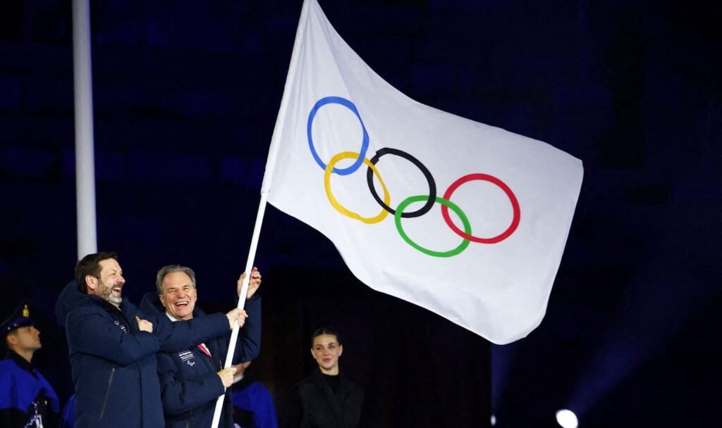 El momento culminante de la moda y el simbolismo ocurrió durante la entrega de la bandera olímpica a los representantes de los Alpes Franceses 2030. La transición fue un diálogo visual entre la sofisticación italiana y la elegancia técnica francesa, cerrando un ciclo donde el deporte y la industria del lujo caminaron de la mano.